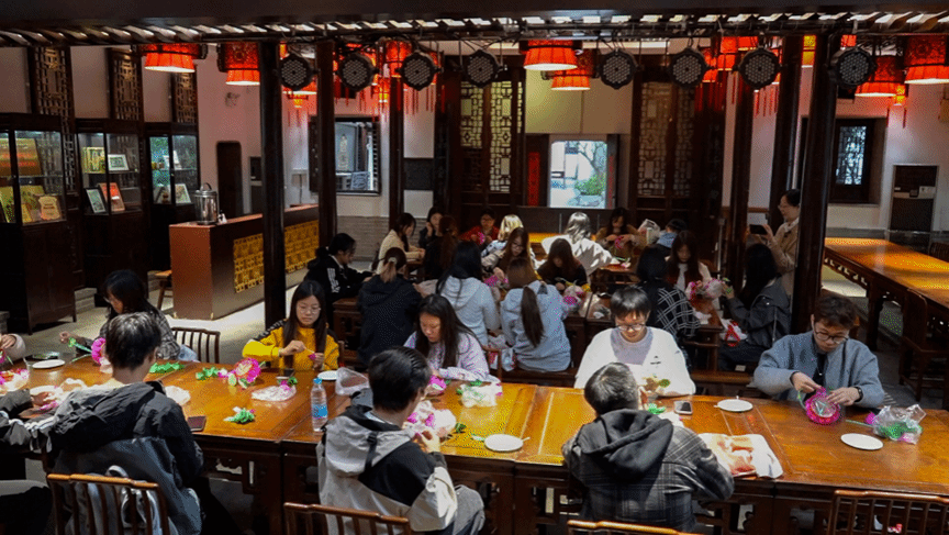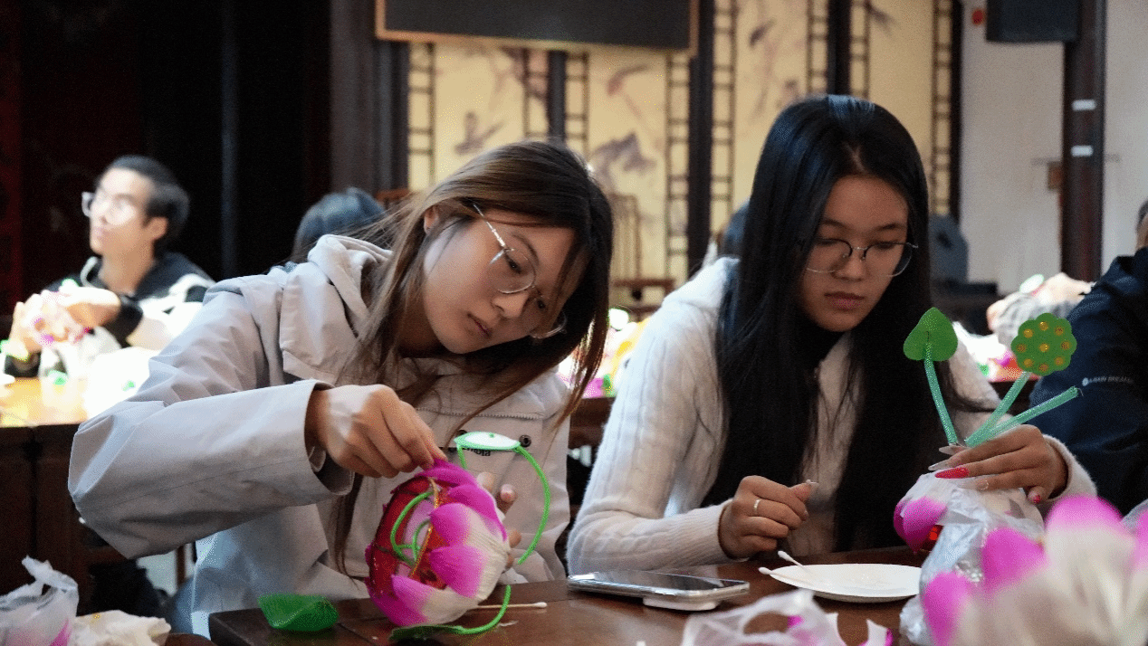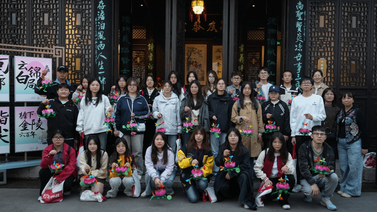 在曹老师的悉心示范和指导下,同学们兴致盎然地动手实践,亲手制作起最具代表性的南京非遗手工——荷花灯。沉浸式的体验不仅让同学们感受到了传统手工艺的独特魅力,更对非遗传承人所付出的坚守与努力肃然起敬。大家围绕非遗项目在当代社会的生存现状、保护措施以及如何借助现代科技与创意实现活化利用等话题,与曹老师展开了热烈讨论,深刻认识到文化传承并非固步自封,而是需要在创新中延续生命活力。
