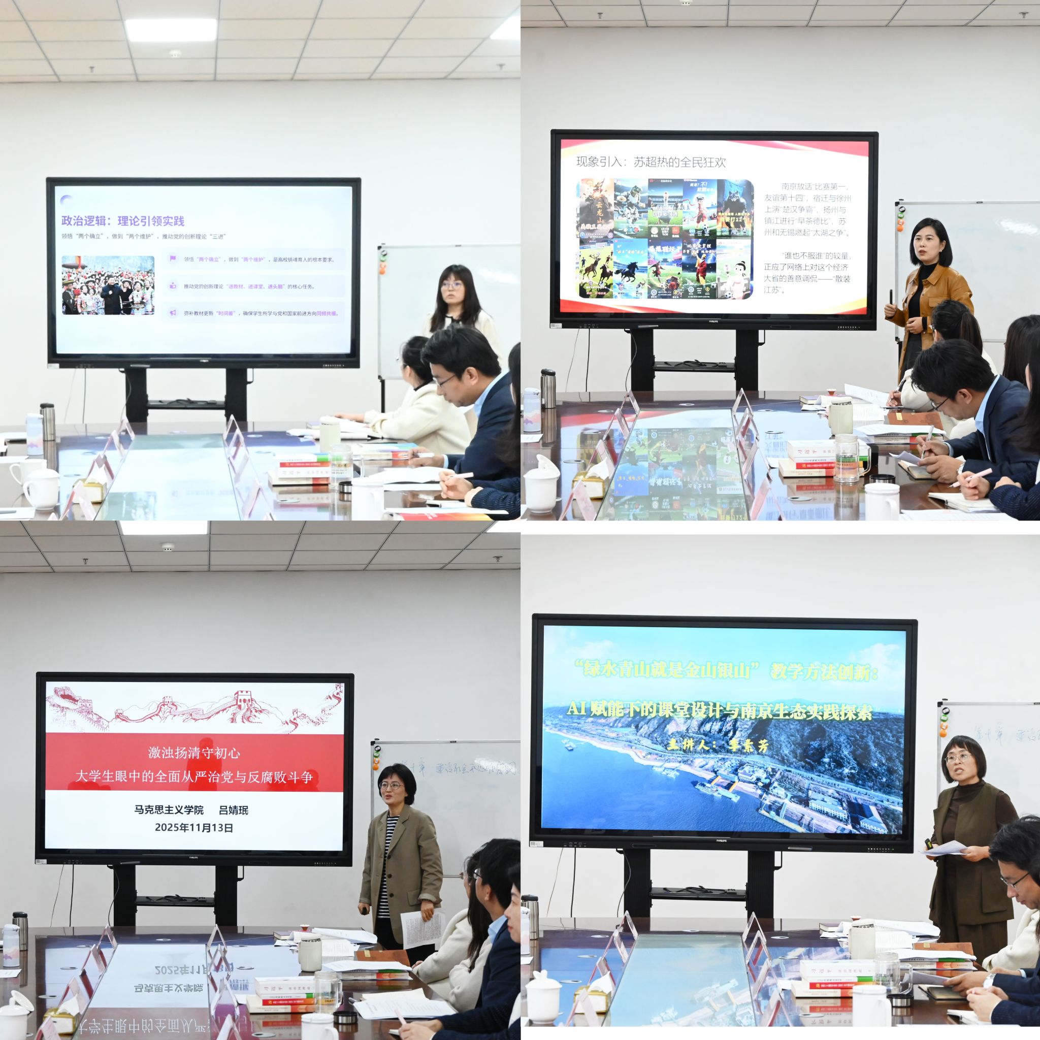 备课会上,刘霆介绍了本次集体备课会的背景和目的,指出此次备课会旨在凝聚集体智慧,共同探索更符合学生认知规律、更具吸引力的教学方法与模式,推动思政课教学实现高质量发展。“习近平新时代中国特色社会主义思想概论教研室”副主任李美娴介绍了《习近平谈治国理政》第五卷与党的二十届四中全会精神融入课程的实施路径,汇报从“为何融、融什么、怎么融”三个维度展开。荣子健、吕婧珉、李素芳等三位教师结合自身教学经验,依次分享了在教学过程中遇到的挑战与困惑,并提出了相应的解决方案。